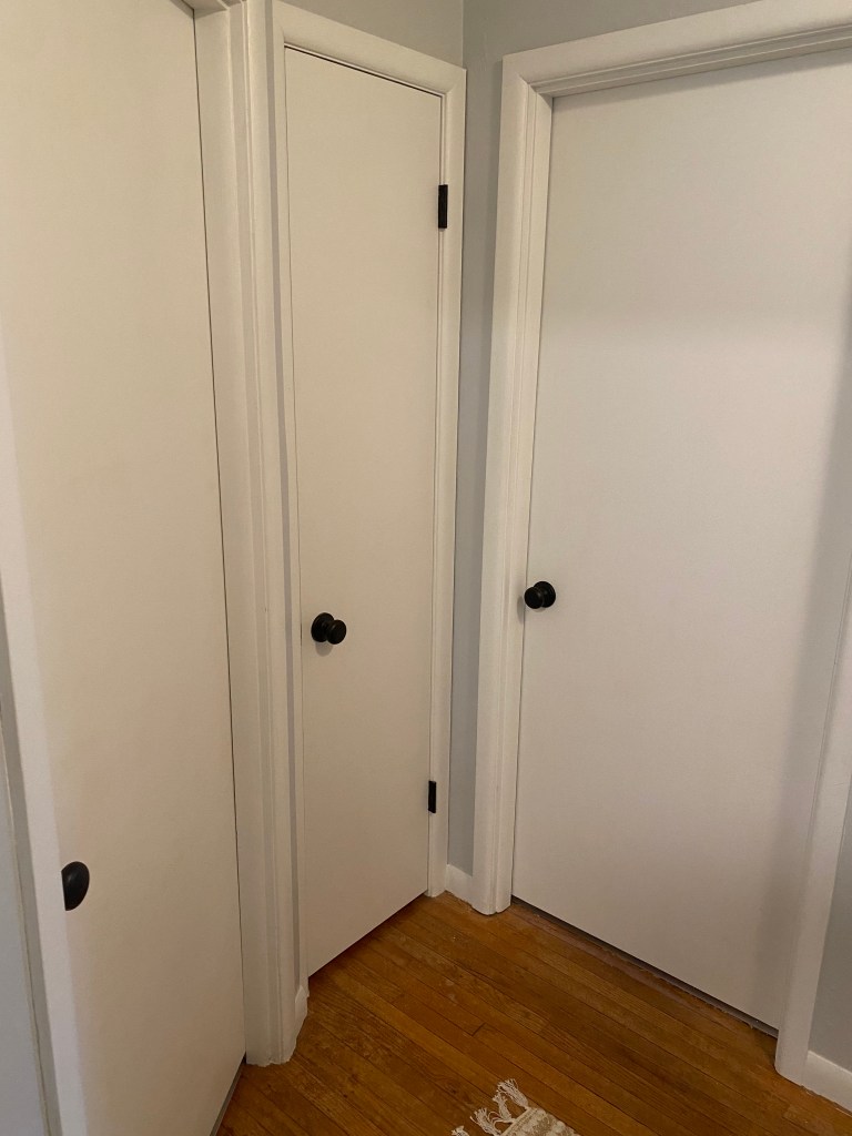 I immediately painted them all white and updated the hardware. For two years I had dealt with the plain white doors because new ones just weren’t in the budget! Pictured are my bedroom, bathroom and closet doors right before I updated them!
