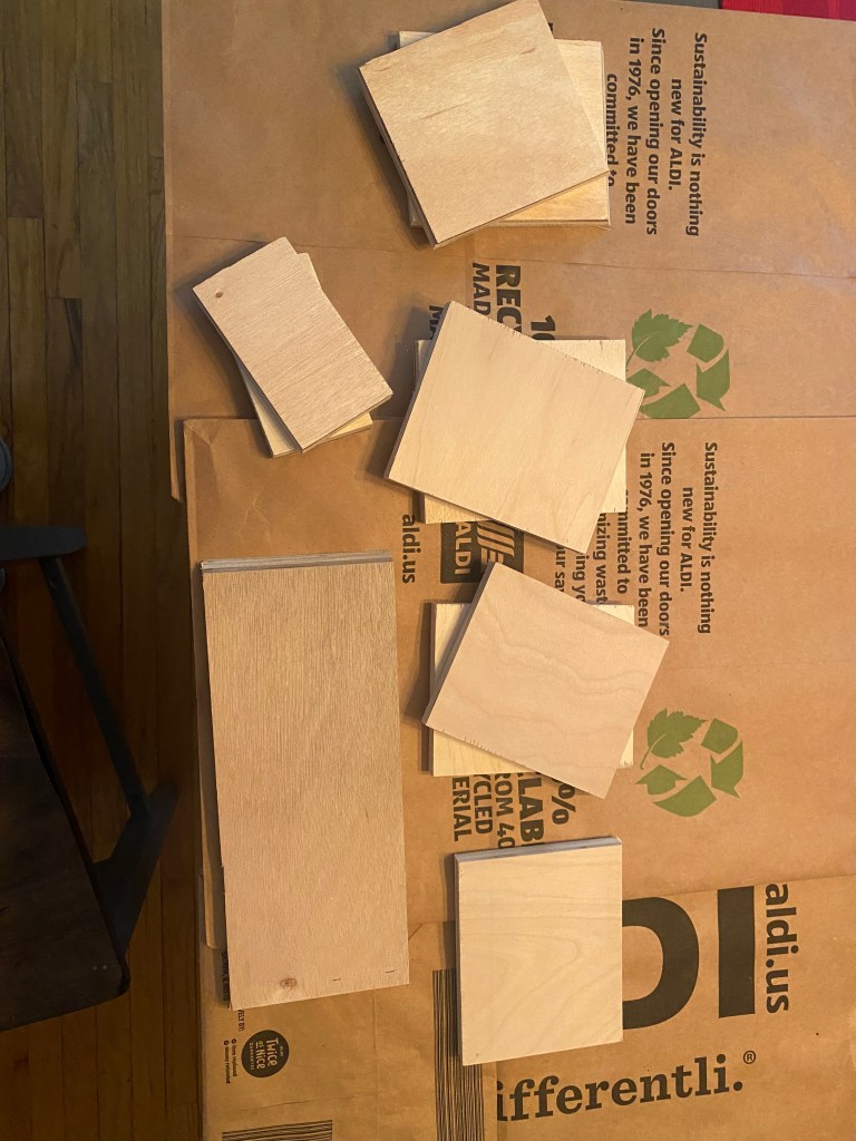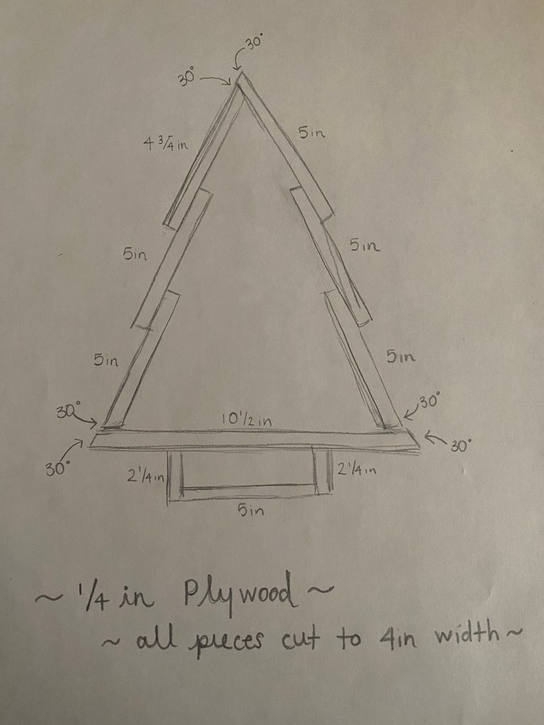 To start you will need to cut your 1/4in plywood into 4in strips. This is the width of the tree, and the width of all of the pieces. You then will be making a total of 10 pieces to put the tree together with. Below is a sketch to better explain the cuts for reference.
