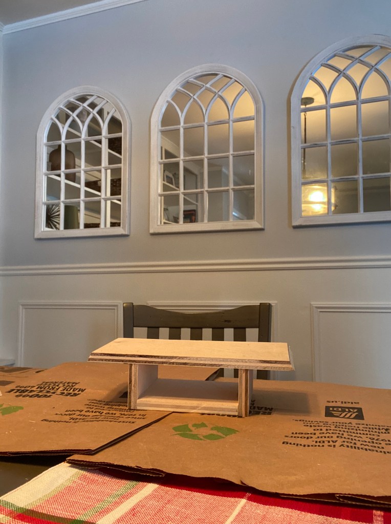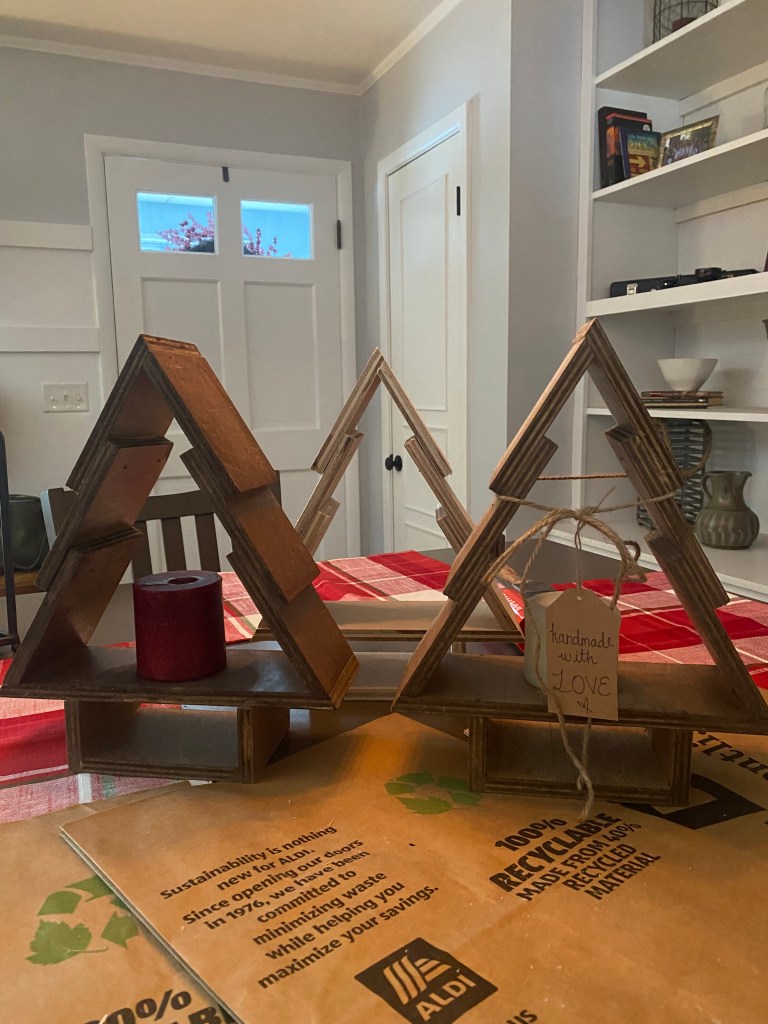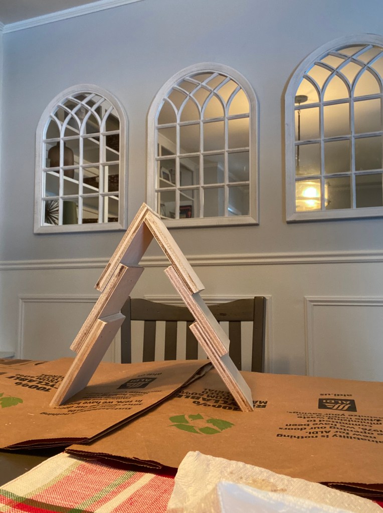 Last year I saw a picture of a Christmas Tree shelf while scrolling on my phone and loved it immediately but couldn’t find one like it anywhere to buy! So then I thought it can’t be that hard to make right? So I gave it a try! I bought a large sheet of 1/4in plywood and played around with different cuts and sizes for the tree. Here is how the tree turned out below… then I will walk you through step by step on how I made it!
