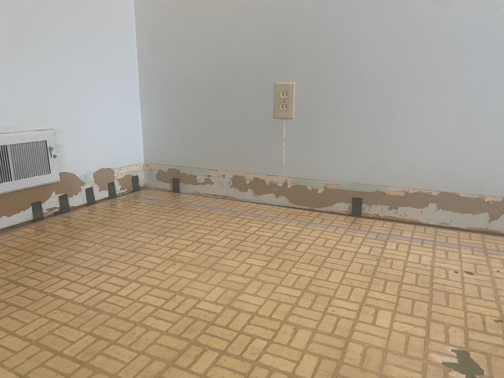 With this type of flooring, it is recommended to leave a 1/4in gap between the floor and wall. So, I taped spacers to the wall like below. The spacers were included in the installation kit that I bought linked above.