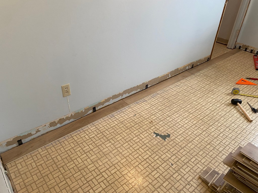 After, I cleaned thoroughly ensuring to clean up all dust and debris! As you can see in the picture, I had to remove my door and the door frame to get the flooring up. This also helped when laying the VPF. Next, I was ready to prepare the VPF for install. I ended up needing 8 boxes for this space. I emptied each box and mixed the planks together. Each box has a slightly different shade and pattern to it. So, I made a big pile to grab from that was well mixed.
