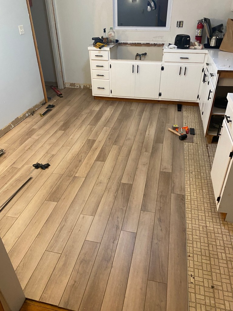 I simply used a straight edge and pencil and trimmed that section with my jigsaw! When you get to your last row, use your pull bar on both the long and short ends with your mallet to help adjoin the seams and lock the pieces into place. With some time and a little patience, this project can easily be installed by yourself and will save you lots of money! Forget the money part though, the satisfaction and feeling of installing VPF on your own is so rewarding! It’s the best feeling, and I love how it turned out! Here it is!