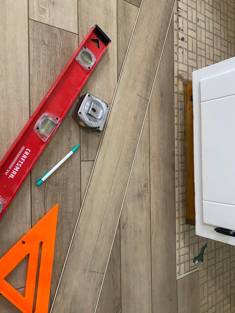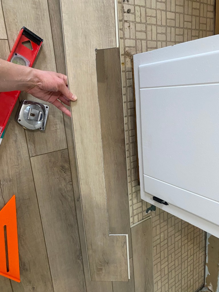 I started in the left hand corner of the kitchen. For the first piece, I placed the tongue side up against the wall . I kept the grove in the corner for the first piece, and left the tongue on the right side. I attached the second plank by placing the tongue into the grove and laying it down while locking it into place. Continue to install the first row. When you get to the final piece, trim the excess with a utility knife. Just remember to account for the expansion gap! This product easily scores and snaps with a little muscle power 🙂 I just used my speed square and utility knife and simply snapped the pieces apart over my knee.