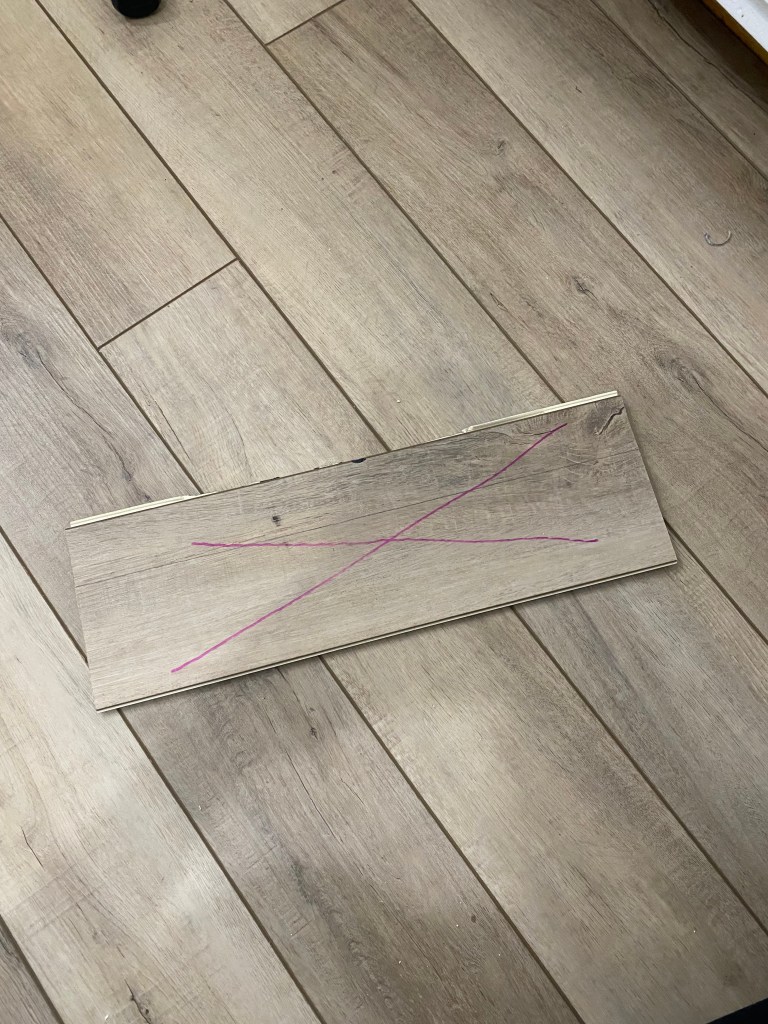 For the first piece in your second row make sure that it is at least 8in long but at least 8in shorter than a full piece so that your seams are staggered and look cohesive in the end. Trim your first piece on the groove end. Place your first piece in the second row down by taking the long end tongue and locking it into the groove. For the second piece in the second row, angle the long end tongue into the groove in the first row and lock it down, while keeping the short end seam as close as possible. I then took two scrap pieces and marked big pink X’s in them.
