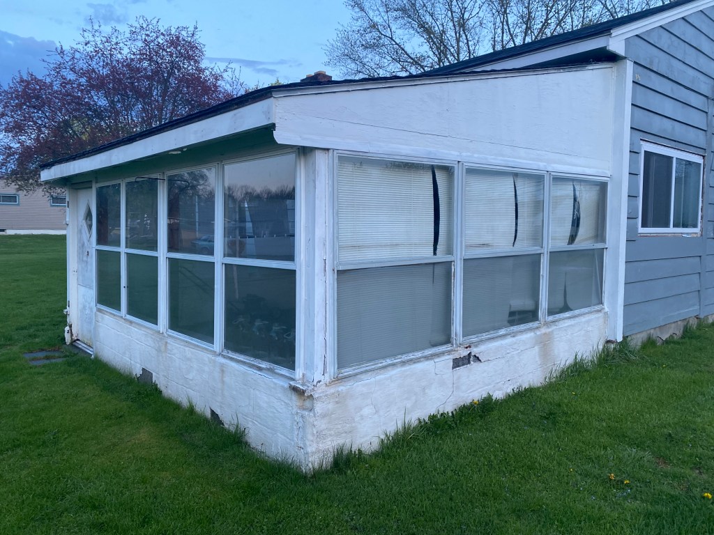 I had all intentions on finishing this step then painting, but my contractor was ready to start on the lower part of the sunroom so I couldn’t. After two days of working, the contractor got sooo much done! Here’s what it looked like before!