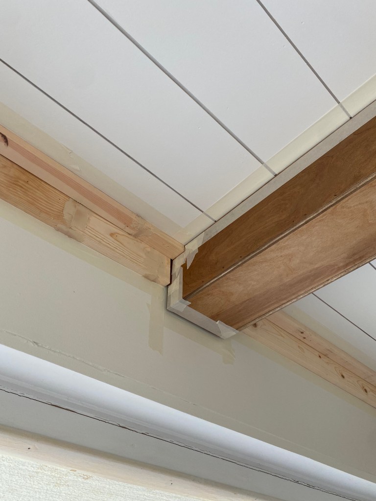 I first nailed the 1×4 flush to the wall and ceiling, then placed the 1×2 on top of the 1×4 flush to the ceiling. I really like how it turned out! I then taped in preparation for wood filler and caulk.