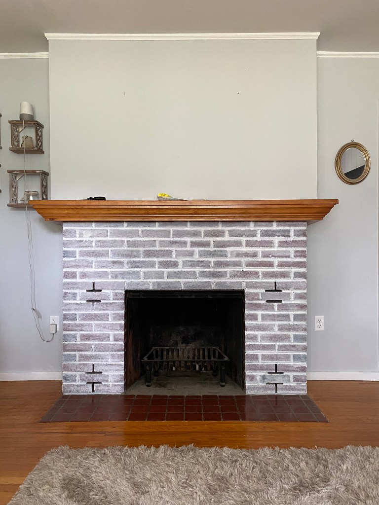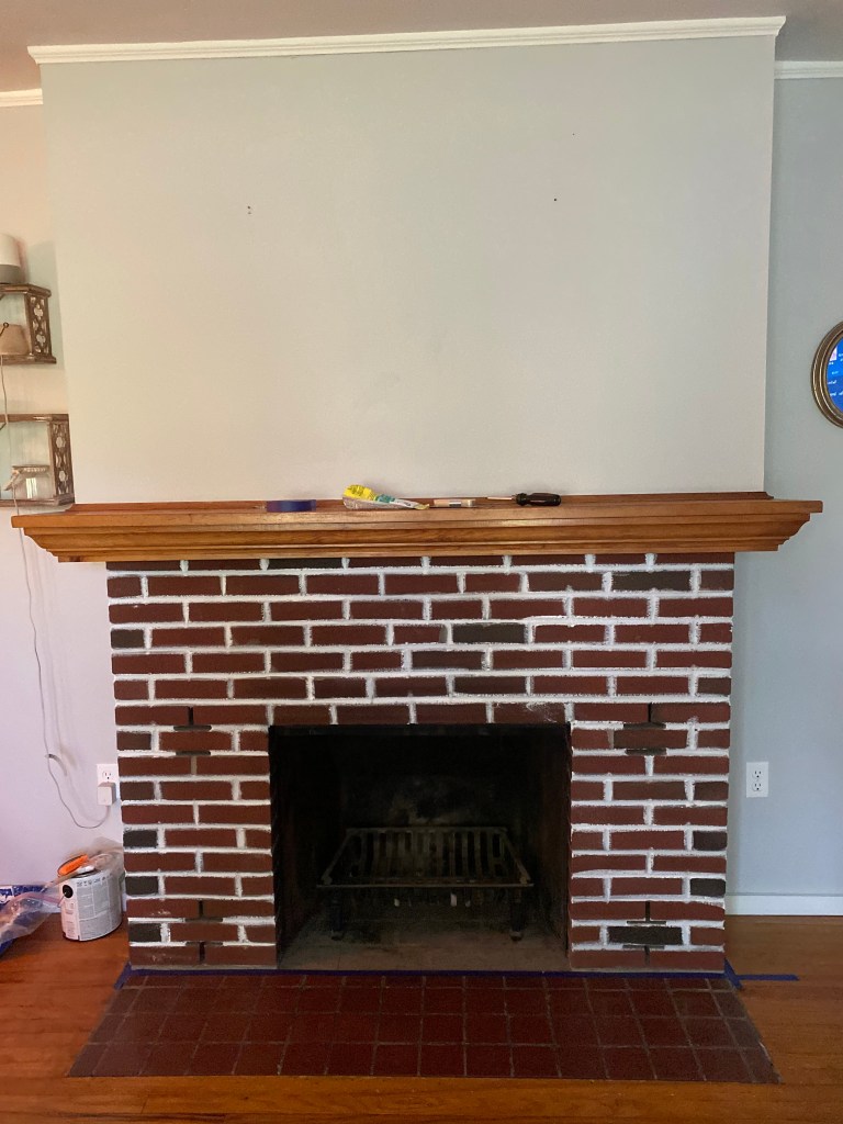 The summer of 2020 I had come up with a plan and got to work! I give you a timeline to prove that projects don’t happen over night, and that turning a house into a home takes time!! Sometimes I feel pressured or rushed to get a ton of projects done around my house, but that just isn’t realistic, and that is ok!! I decided I wanted to first whitewash the brick. To do this I first painted the grout lines using a paint brush with white paint (not diluted).