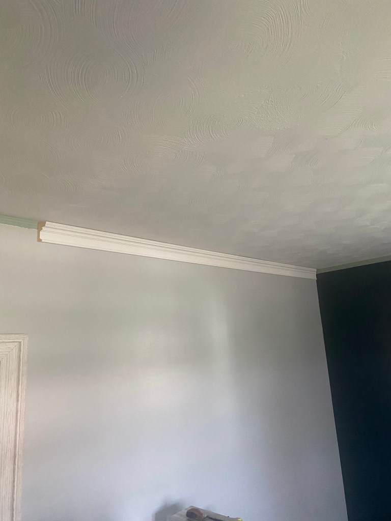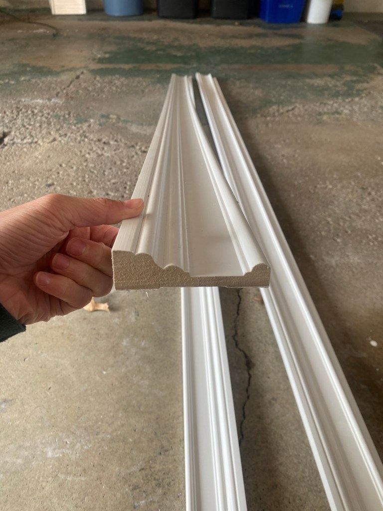 This was super simple to remove. I just used my pry bar to pull the crown molding from the wall and ceiling and gently removed the old trim along with the nails. Once the old crown molding was down I was ready to get started on installing the new molding. She picked out a beautiful ceiling molding. This is a non traditional crown molding, but actually way easier to install so I was happy! Here is a profile shot of the molding for better reference!