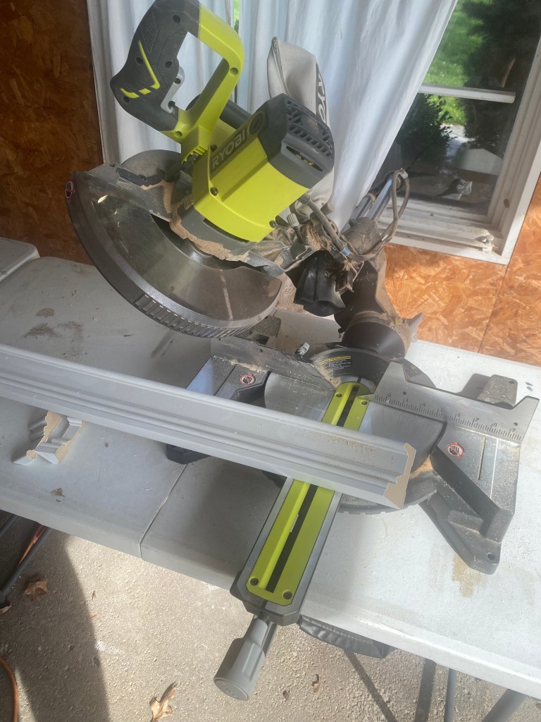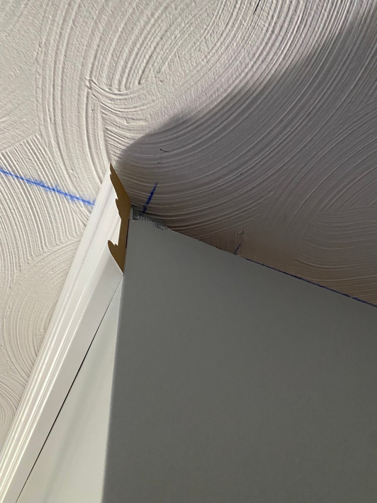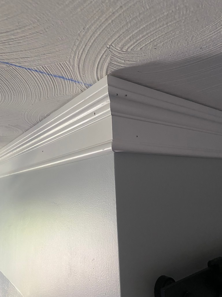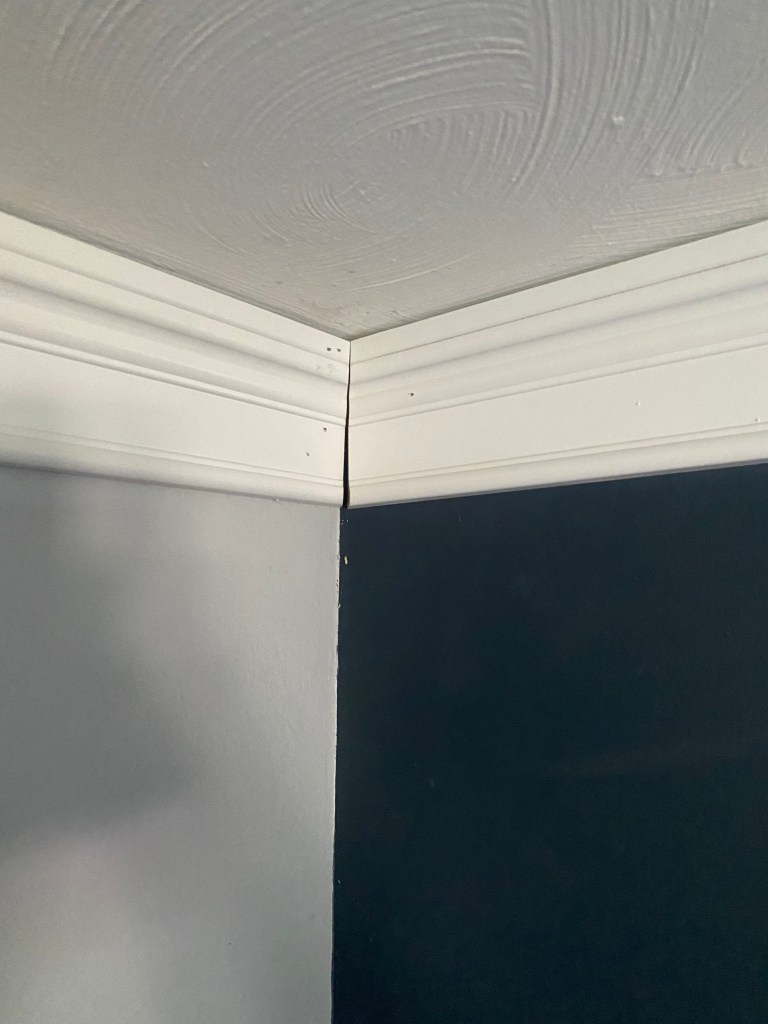 Here is the continuation of the room I was working in. You can see in the picture right above a good example of an outer 45 degree cut. You are simply just cutting your boards in the opposite direction as the inner 45 degree cut. It is always safer to cut bigger and have board to be able to trim rather than cut too much off with your miter saw, because then you can’t go back and that is a big waste of expensive molding! It is so worth it to re-measure a million times and make a million tiny cuts on the same board to get the perfect fit!
