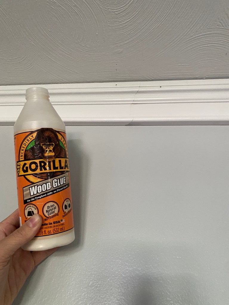 I continued taping around the trim work in the same direction (this is important when it comes to removing the tape – will make it easier to remove). Make sure to use your finger nail to firmly press the tape into the wall ensuring no bleed through. After you’re are done taping you are ready to caulk . I used DAP molding caulk and applied a thin bead to both the top and bottom of the molding. I then used a damp paper towel with a small amount of dawn dish soap to smooth out that caulk line. Like I said earlier, I also used caulk to fill in my nail holes and gaps between boards. I also used my damp paper towel to smooth these areas out.