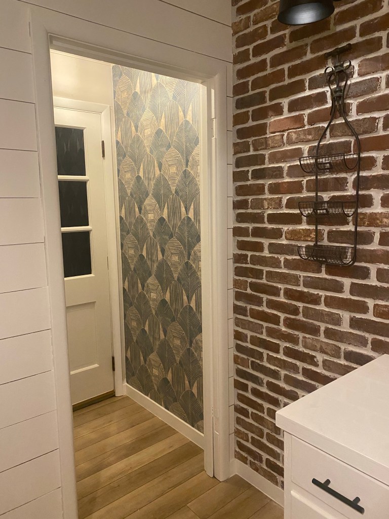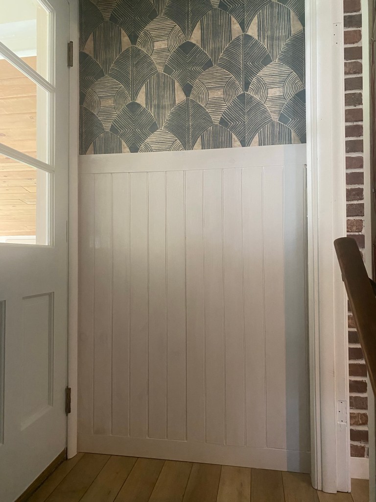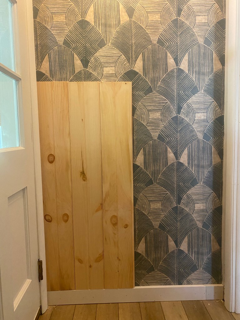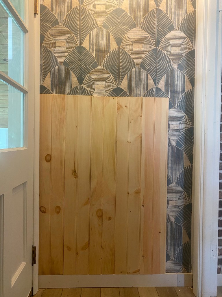 I brought the wall planks home and originally cut them to 5ft tall but decided to shorten them to 4ft tall because I didn’t want all of the wallpaper to disappear. Here’s the first board up before I trimmed it down to 4ft.