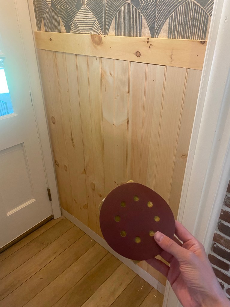 After the wall planks are finished being put up I cut my 1x4in board to the width of the wall and nailed it in place right on top! I then used 120 grit sandpaper to smooth all of the wood down!