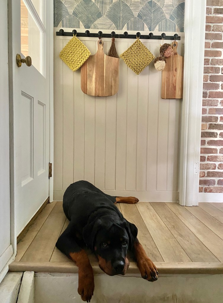Then I decided on a paint color! I went with calico cream in eggshell which nicely tied in my trim in my sunroom with the window trim in my kitchen and just so happened to match the beige in the wallpaper! After that dried I put up these hooks I purchased from a local shop!